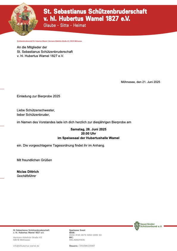 Wir laden alle Schützenschwestern und -brüder herzlich zur Bierprobe in die Hubertushalle ein.